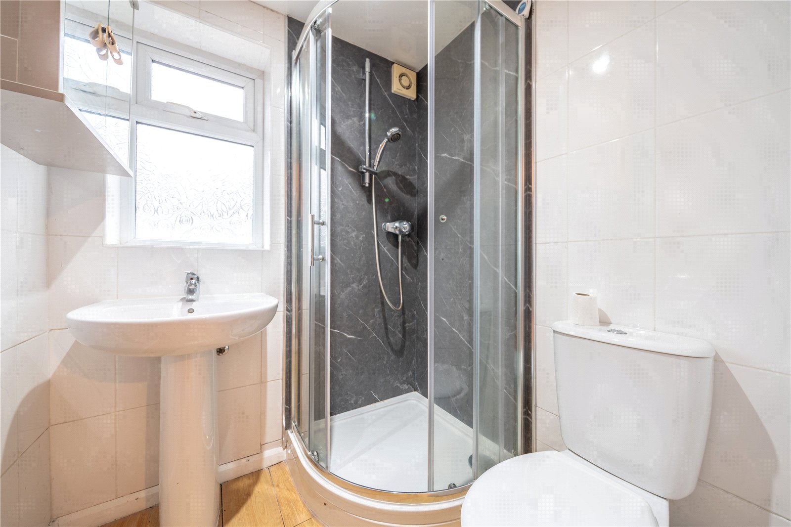 Frosted double glazed window. Fitted with a modern suite comprising quadrant shower enclosure, a WC and pedestal wash hand basin. The shower enclosure is fitted with easy to clean aqua board panelling and the ceiling has been clad. The walls are tiled and there is a chrome heated towel rail, extractor and a downlight.