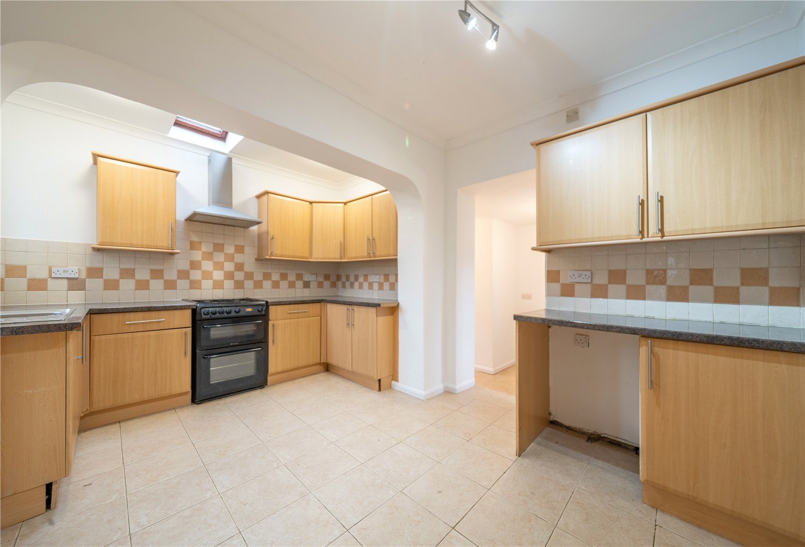 Extended at the side, the kitchen is a good size and fitted with beech style base and wall units, speckled worktops, tiled splashbacks and a stainless steel sink with drainer. There is a gas cooker with hood above, space for an undercounter fridge, three ceiling lights and a radiator. A walk in pantry provides extra storage and has shelving, a light and double glazed window.