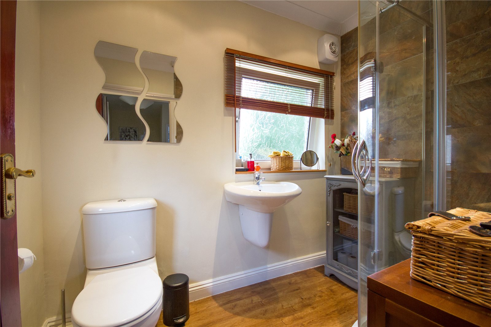 Frosted UPVC double glazed windows to the side and rear aspects. A modern shower room with stylish stone style tiling to the walls, downlights to the ceiling and a heated towel rail. The suite comprises a quadrant shower cubicle, WC and wall hung half pedestal wash basin. Extractor.