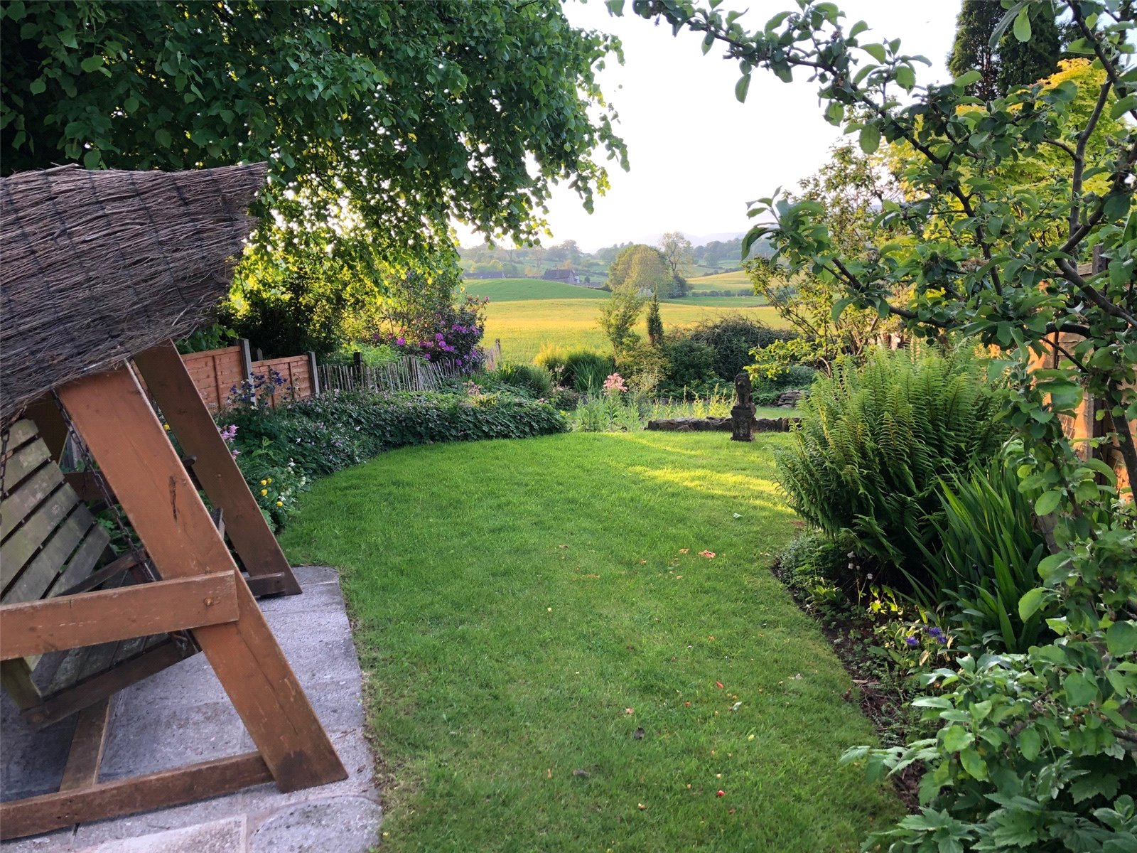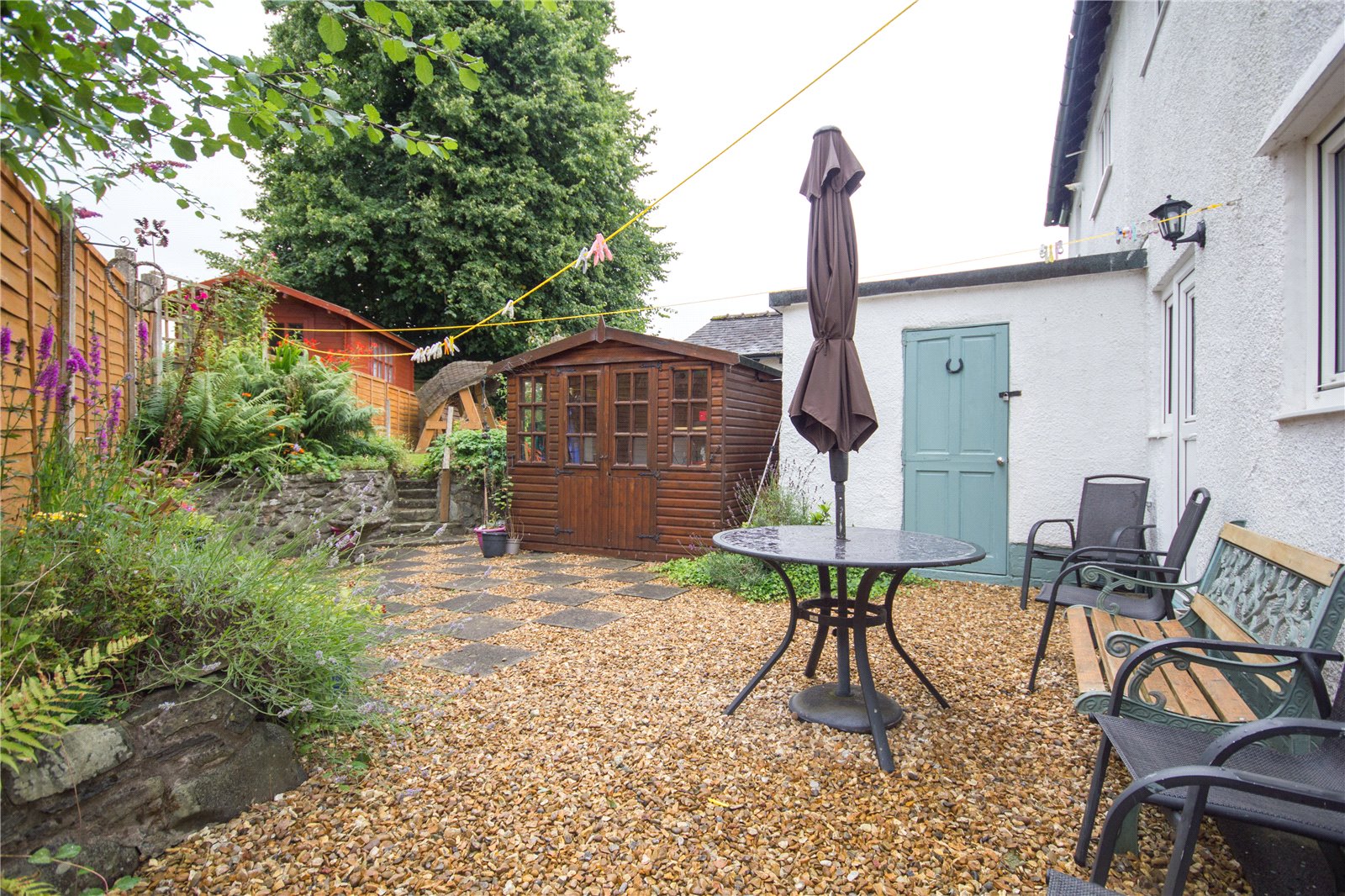 To the front of the house is a sloping garden, gravelled for ease and interplanted with cordylines and ornamentals. There is access at the side, passing a bin store, and via a gate into the rear garden. The angled plot is divided into two areas. A patio close to house offers and al fresco dining area, fencing provides privacy and there is a summerhouse (power connected). A block built outhouse provides further storage and measure 8' 4" x 2' 5" (2.54m x .74m). External tap. Steps lead at the side of the summerhouse into the rear/side garden. Larger than expected, this space has mature pretty flower borders, a central lawn and a swing seat from which to admire the view. A lower area has a central gravel wildflower bed and well stocked borders.
