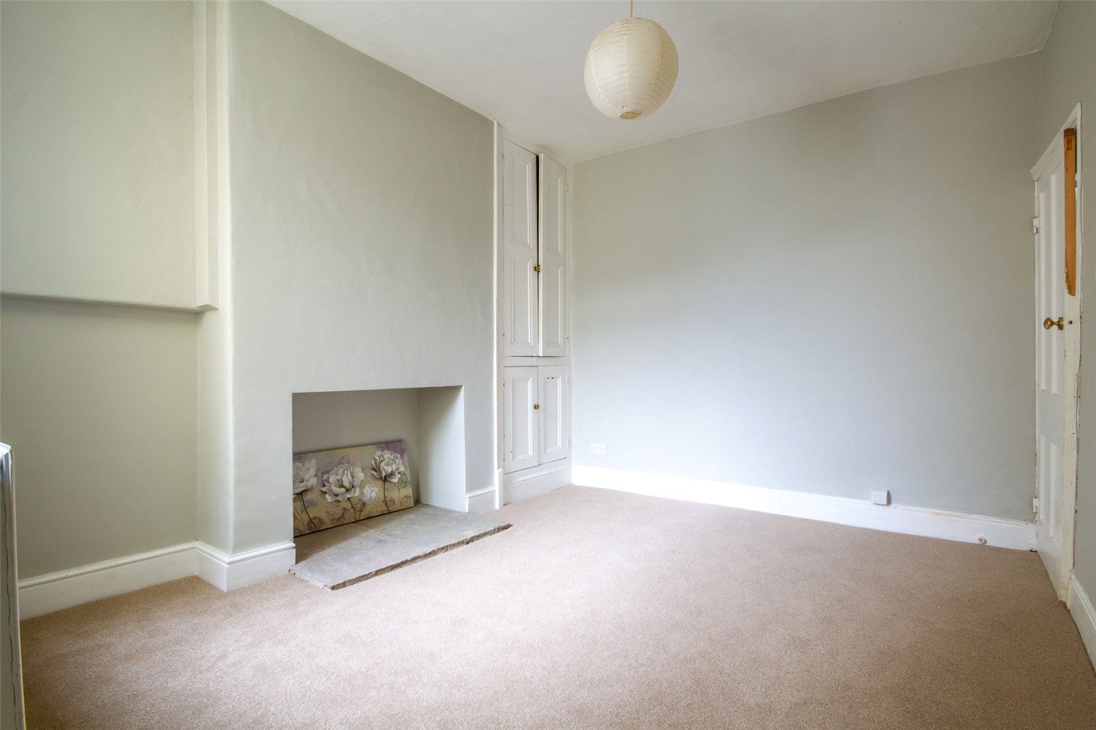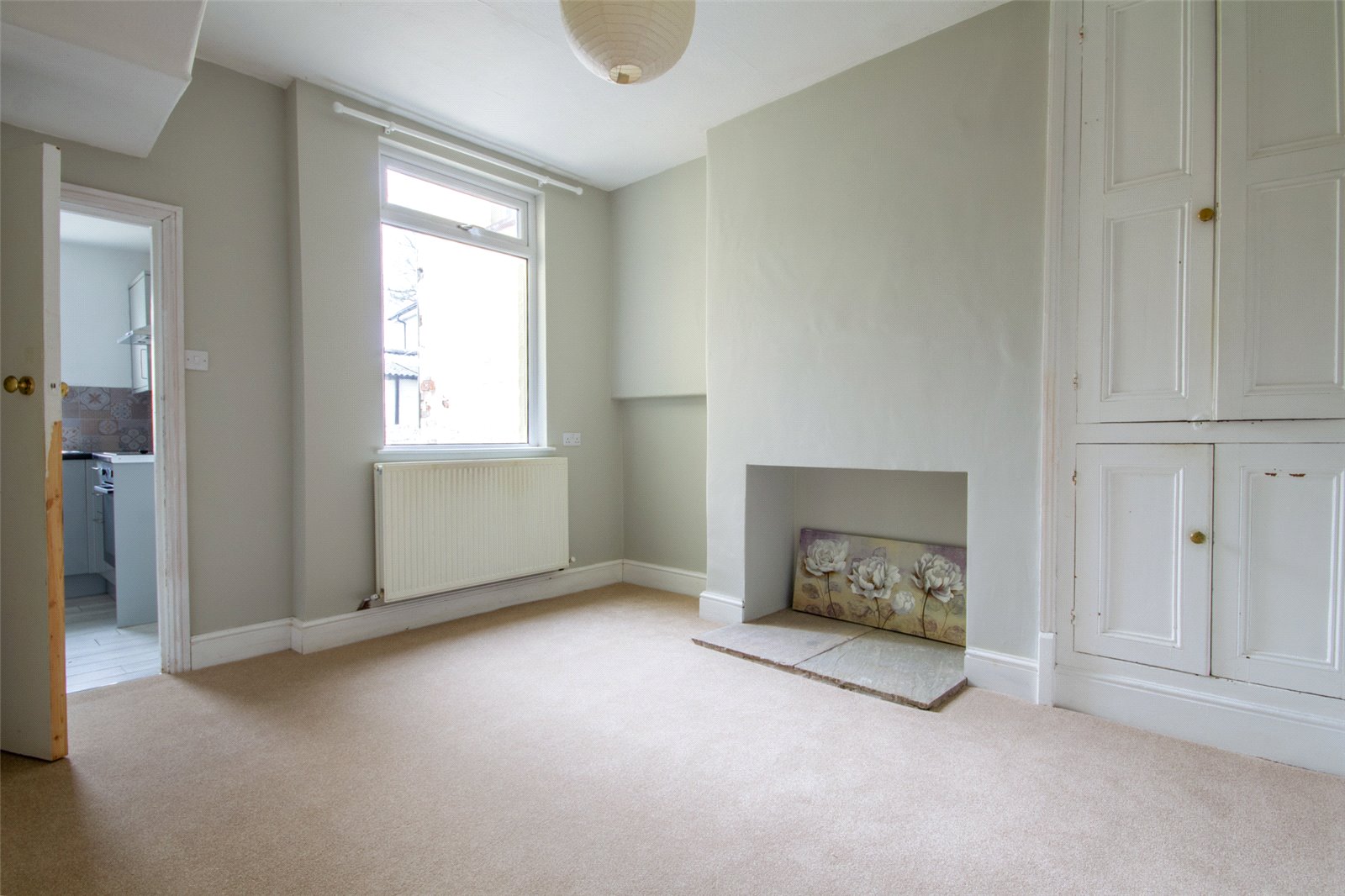 Facing the rear elevation, recess for electric fire with slate hearth and adjacent inset double cupboard. Radiator, ceiling light and telephone point.