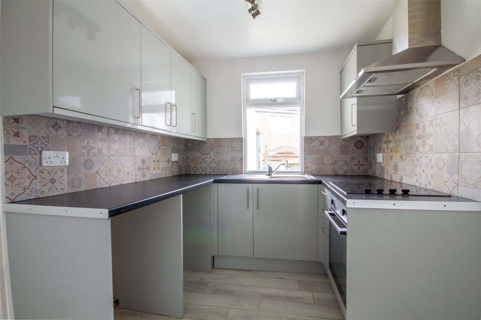 UPVC double glazed window overlooking the rear yard. Fitted with a range of grey gloss slab fronted base and wall units with co-ordinating dark worktops and stainless steel sink with drainer. Moroccan inspired splashbacks along with a pale tiled floor. Electric hob with canopy over, electric oven and space for under counter fridge. Plumbing for washing machine. Ceiling light and door to rear yard.
