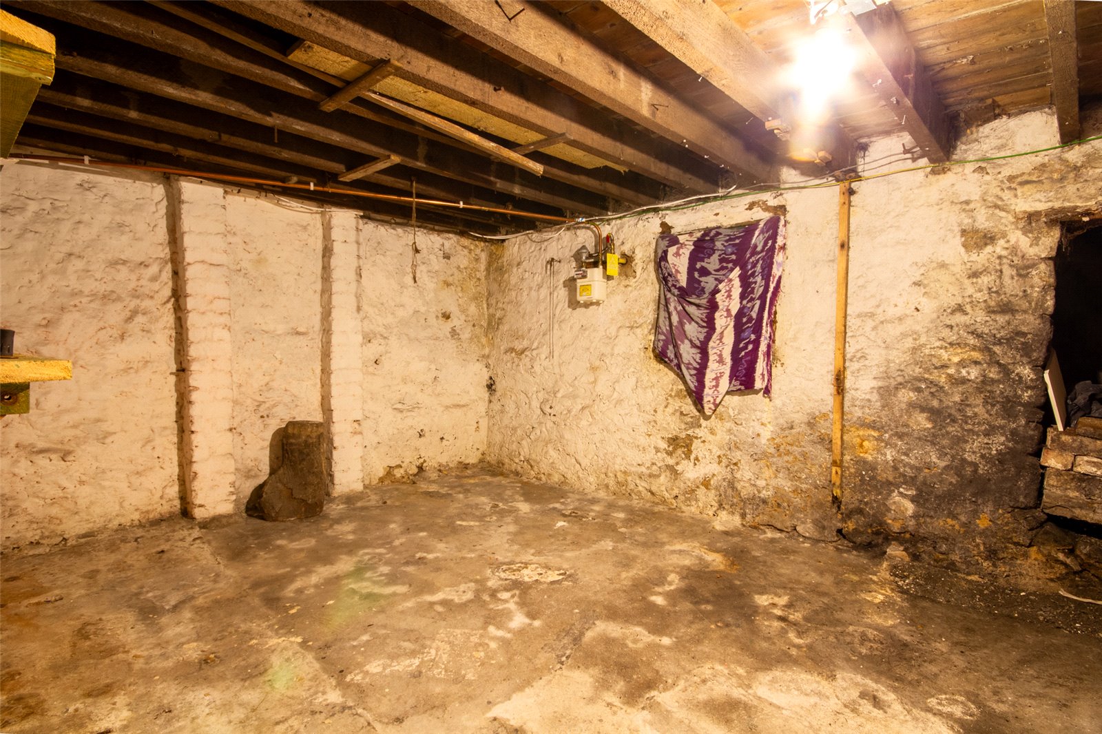 Stone steps lead down to the cellar which is currently used for storage. Ceiling light.