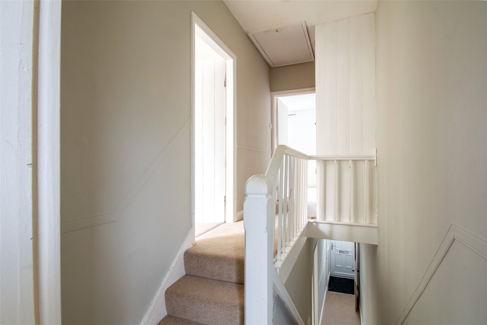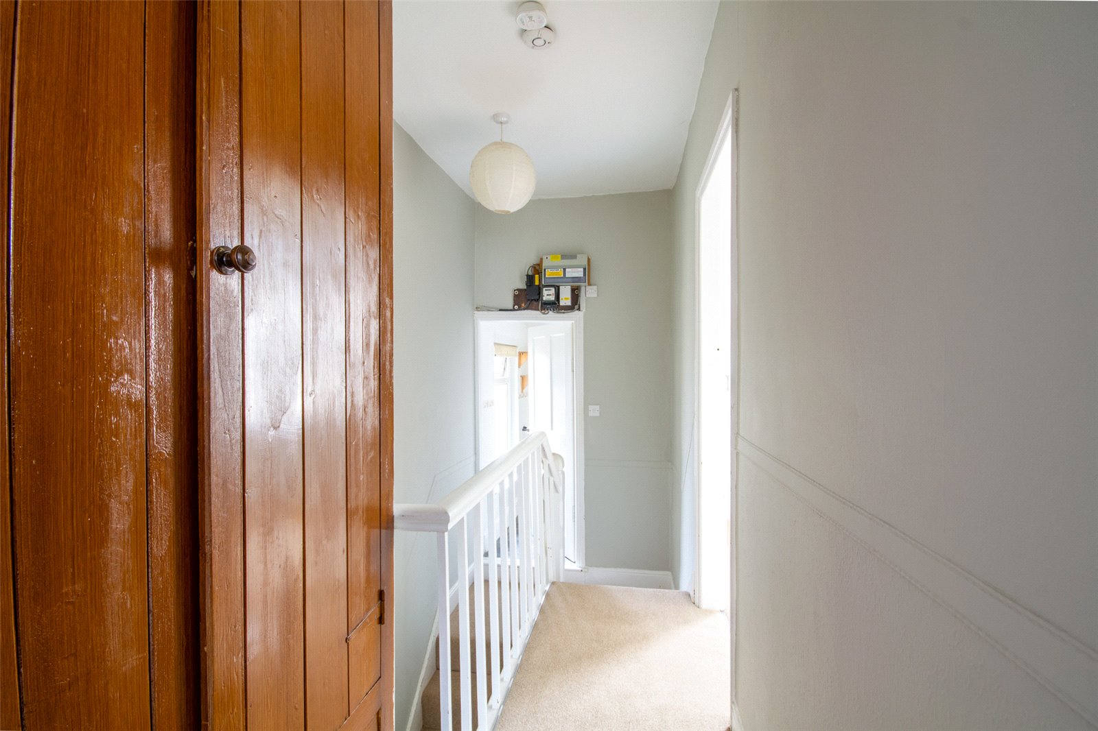 Split landing with access to the loft and large built in cupboard. Ceiling light.