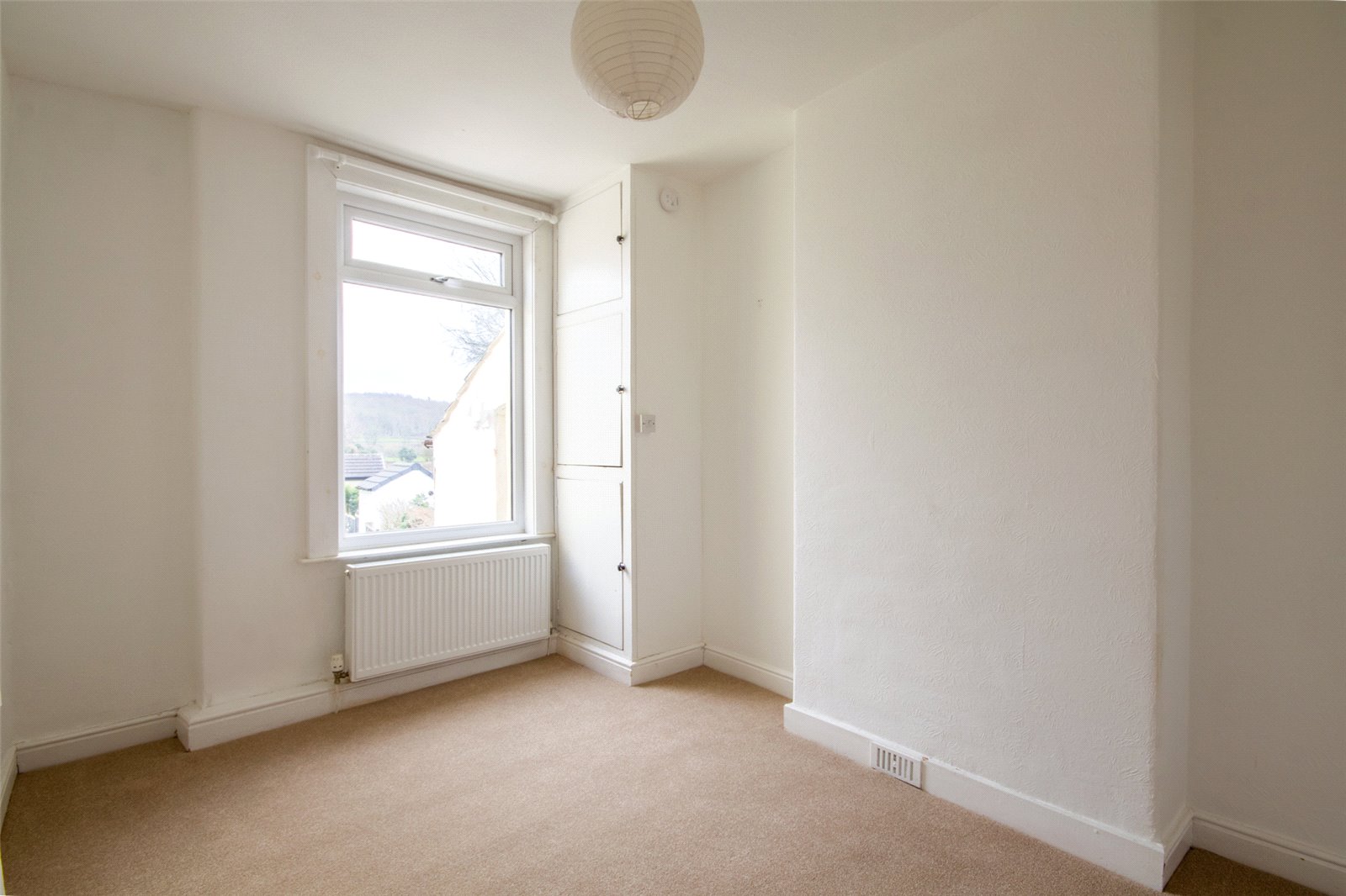 UPVC double glazed window facing the rear elevation - there is a view between houses towards hills, ceiling light and radiator. Built in cupboard housing the Glow Worm boiler.