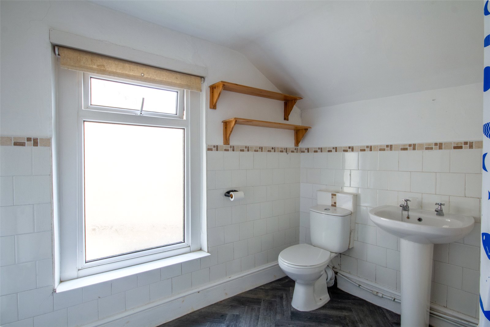 Frosted UPVC double glazed window facing the side aspect. Bath with shower over, pedestal wash hand basin and WC. Tiling to the walls, radiator, ceiling light and extractor.