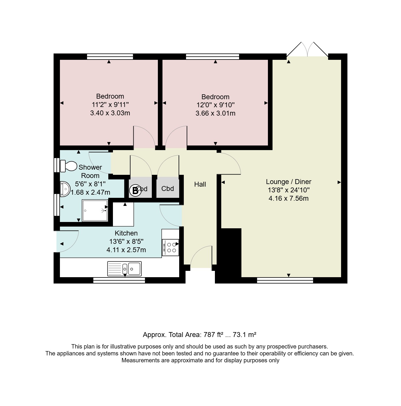13' 8"/7' 10" x 24' 10"/14' 7" (4.16m/2.39m x 7.56m/4.45m)