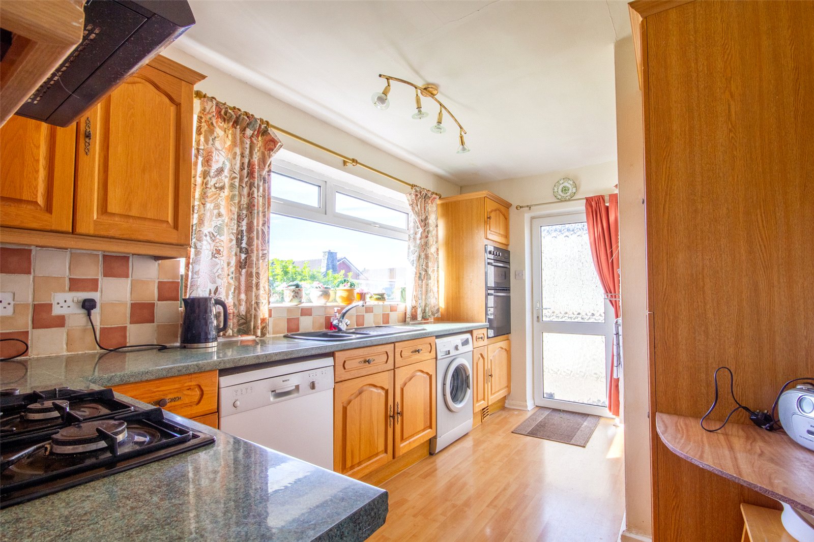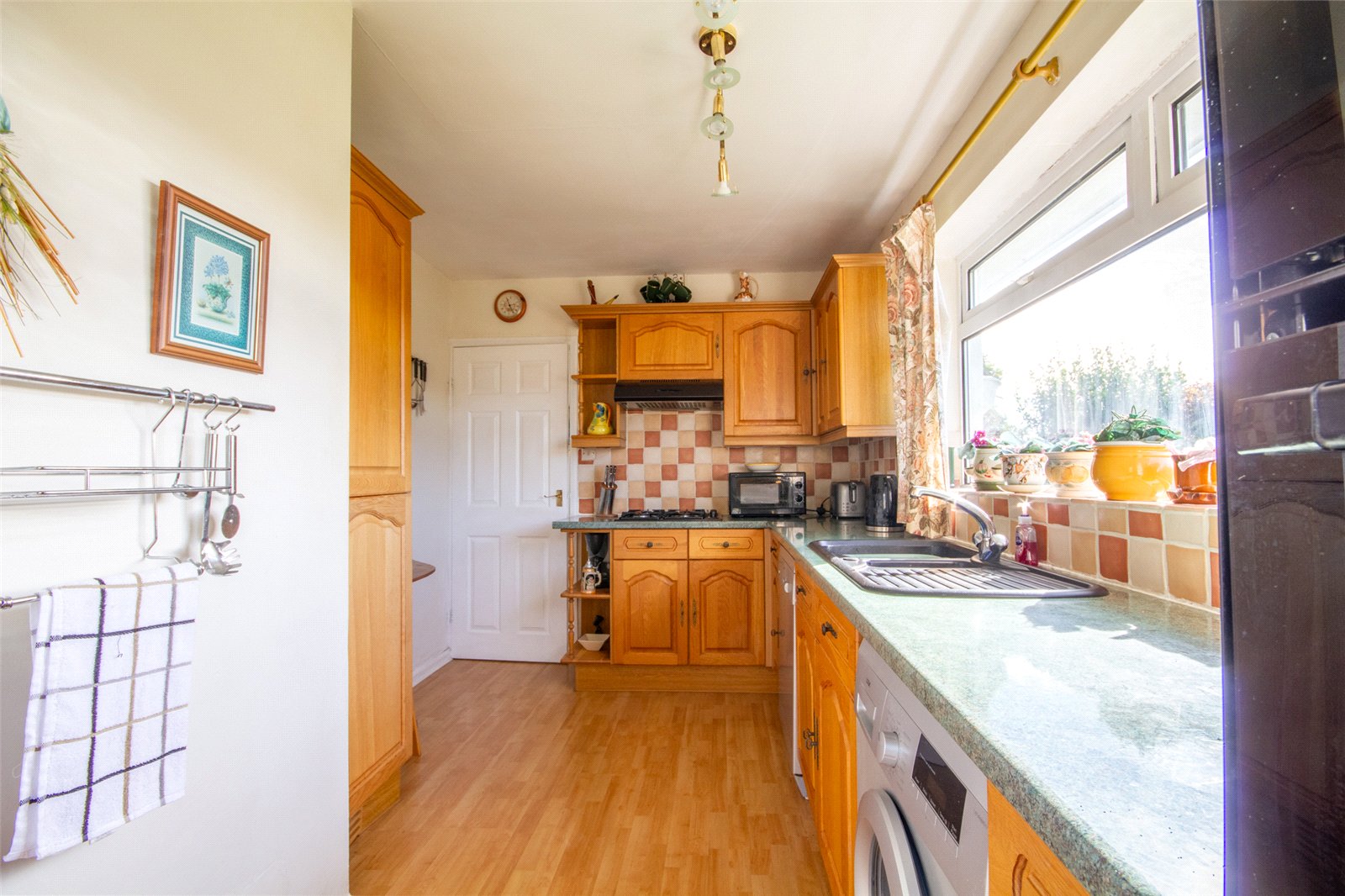 Also facing the front aspect, the kitchen is light and bright and fitted with warm oak style base and wall units, green worktops, tiled splashbacks and a dark one and a half bowl sink with drainer. Gas hob with hood above, an electric double oven and an integrated fridge freezer. There is plumbing for both a washing machine and dishwasher, a ceiling light and radiator. A frosted UPVC double glazed door leads to the side/driveway.