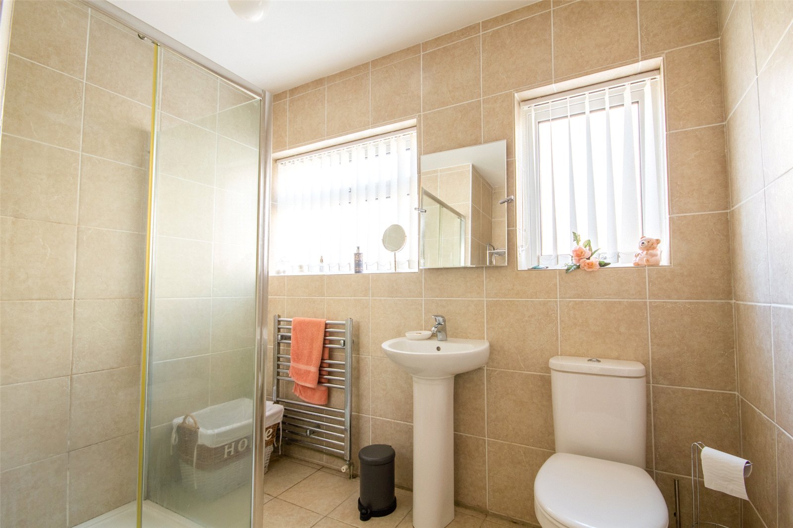 Fully tiled including the floor, the shower room is fitted with a modern cubicle, a pedestal wash hand basin and WC. There is a chrome heated towel rail, two ceiling lights and two frosted UPVC double glazed windows.