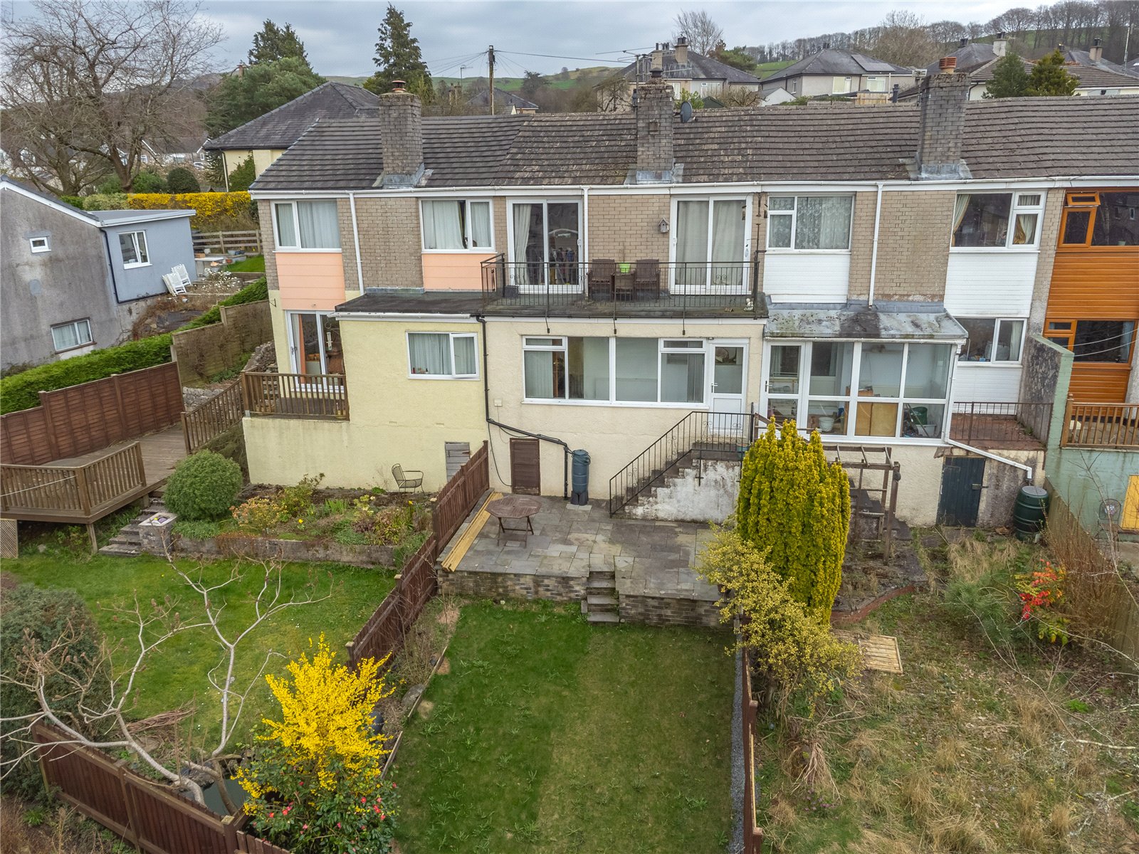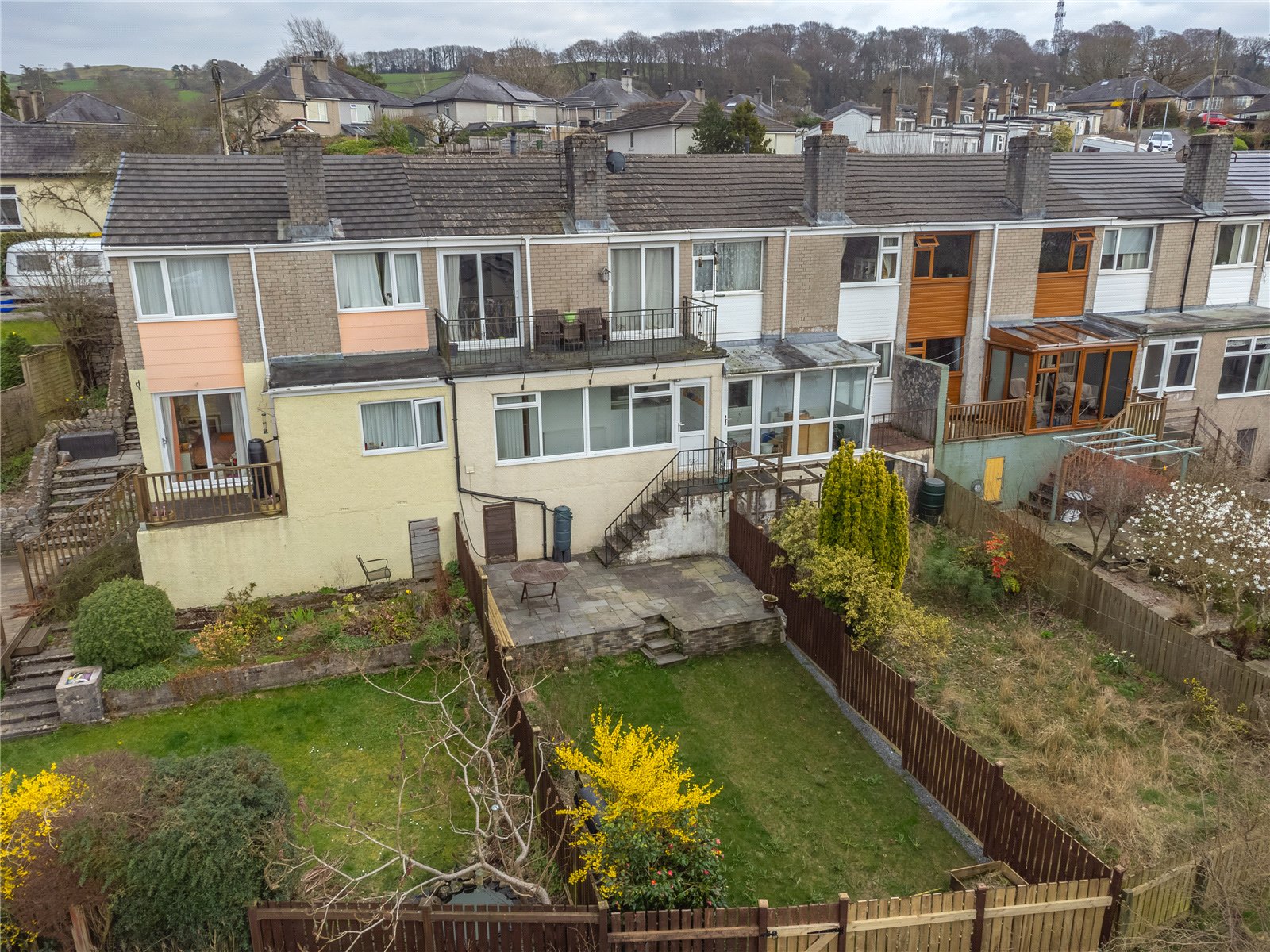 The perfect place for morning coffee or evening glass wine with excellent views over Kendal at the rear and side view towards distant Lakeland Fells. Metal railings.