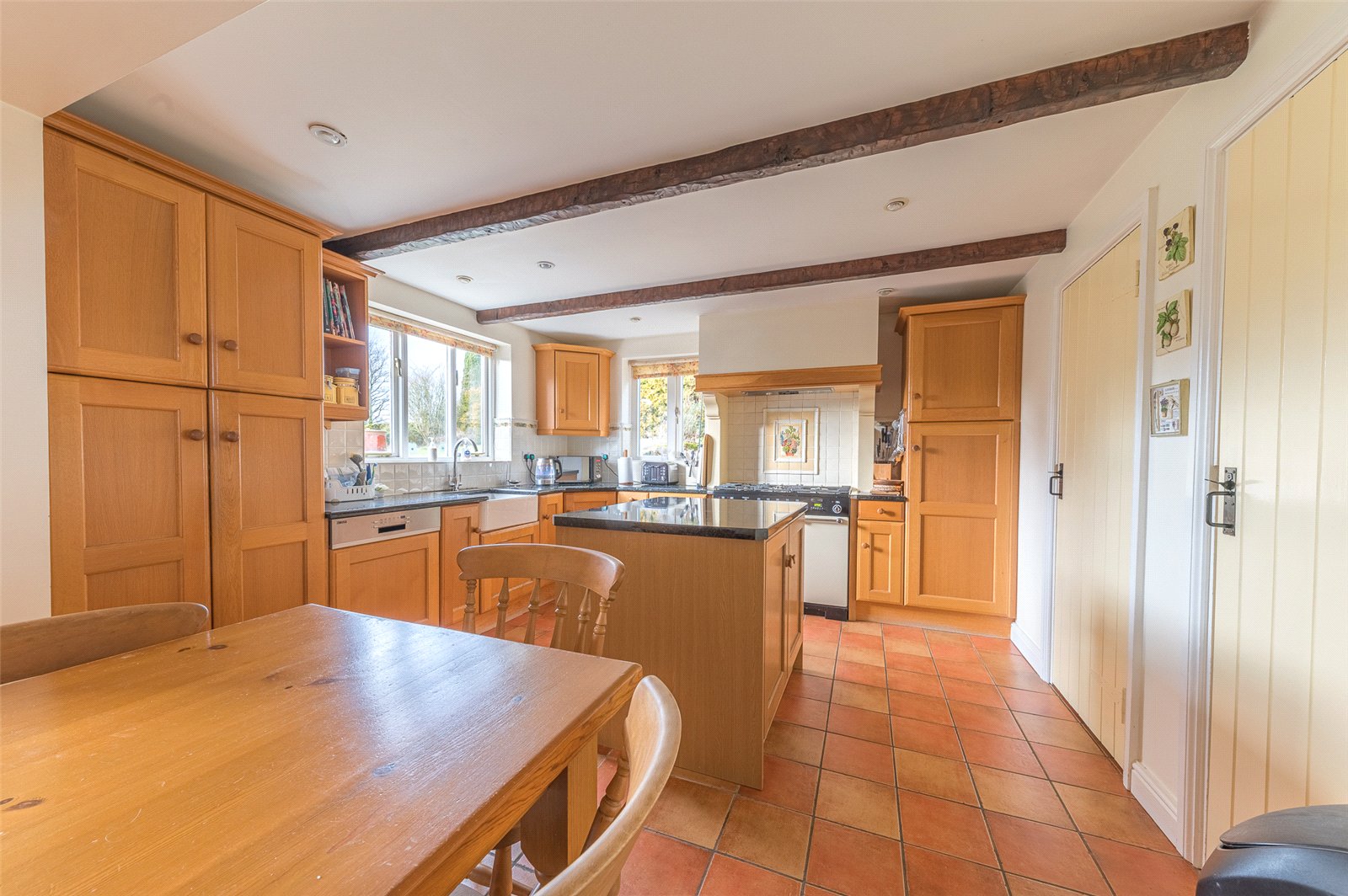A welcoming entrance into a family home with a double glazed window in the dining area overlooking fields at the rear, a built-in coat cupboard with hooks, two radiators and spotlighting and beams to the ceiling. The kitchen area has double glazed windows facing the front and side aspects and is fitted with mid oak style base and wall units, quartz style worktops, a butler sink and tiled splashbacks. There is a five burner gas range cooker with hood above, an integrated fridge freezer and a dishwasher. A central island provides further work space and storage and there is spotlighting and beams to the ceiling. There is a walk in pantry space with shelving, light and power and a frosted double glazed window. A separate laundry cupboard houses the boiler and there is plumbing for a washing machine, a light and shelf.