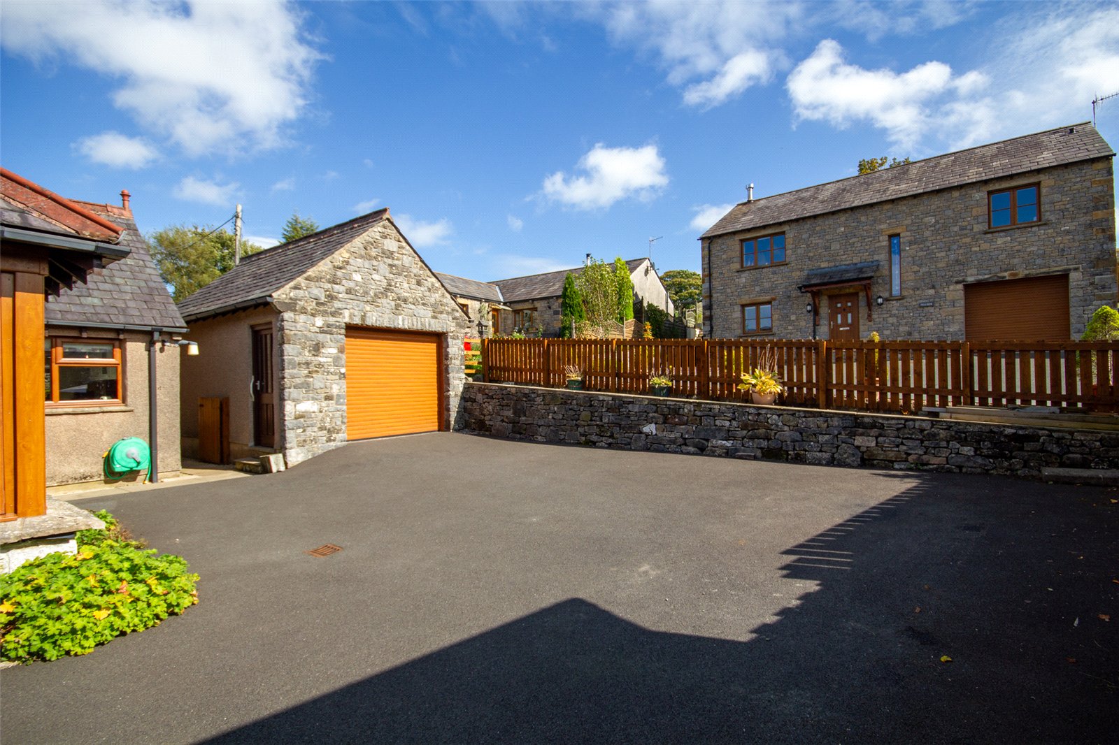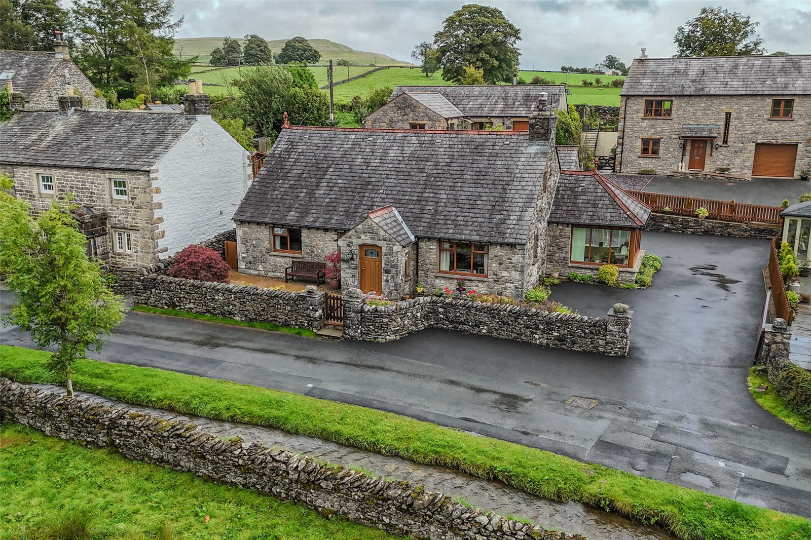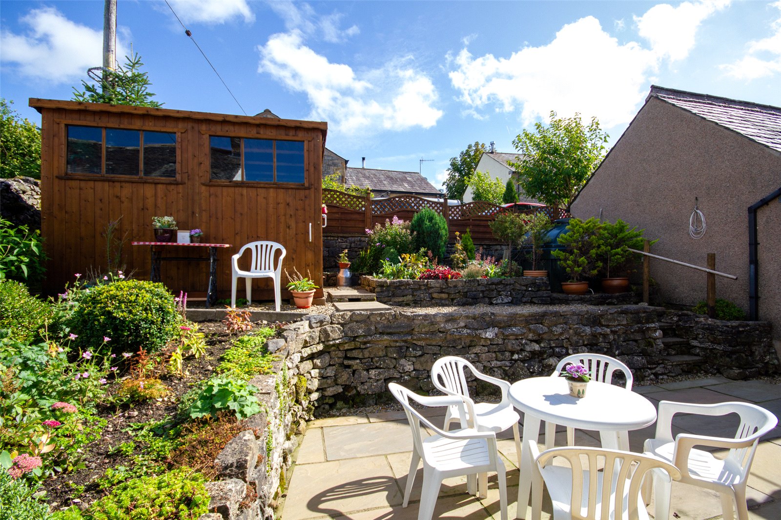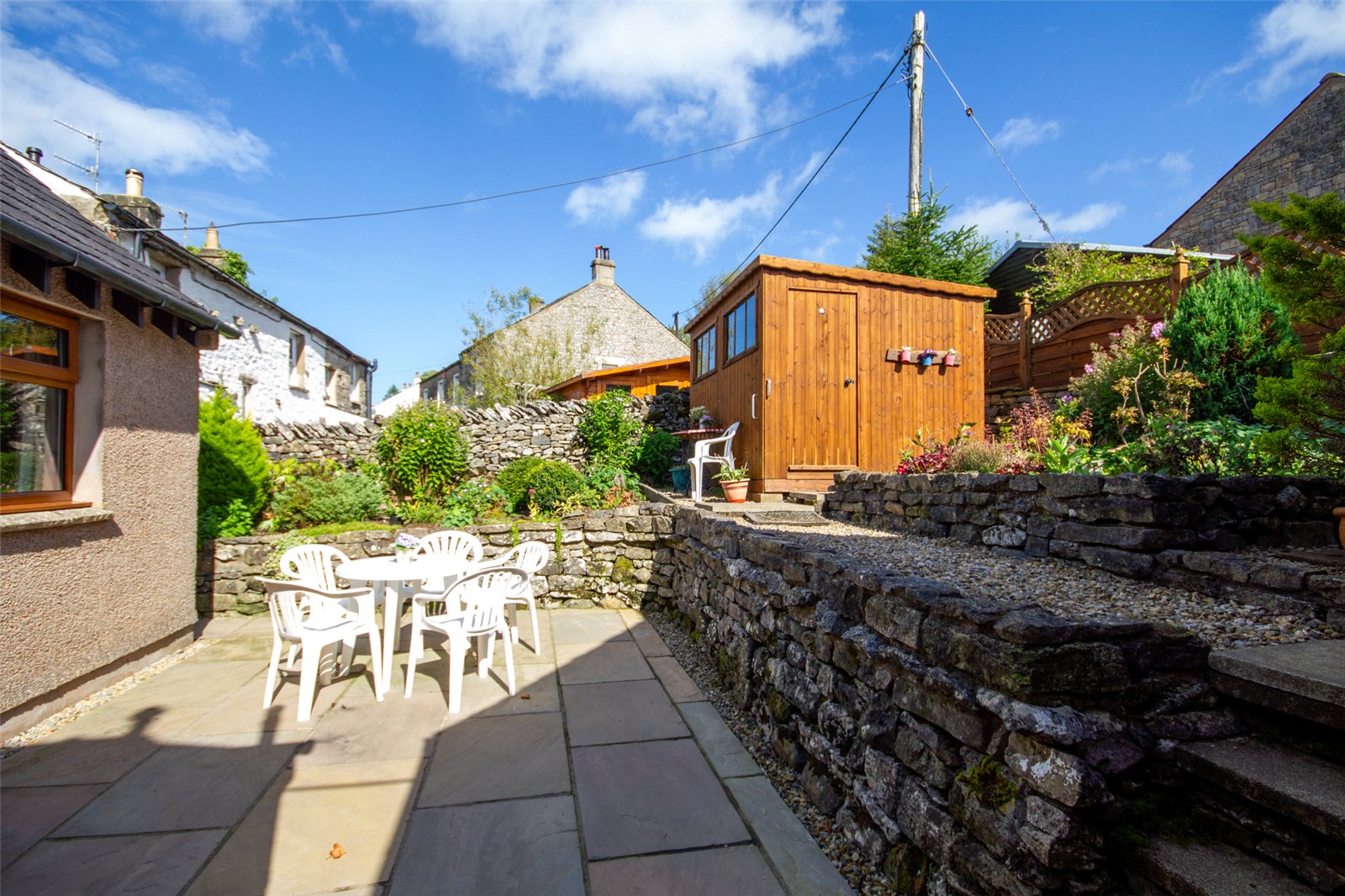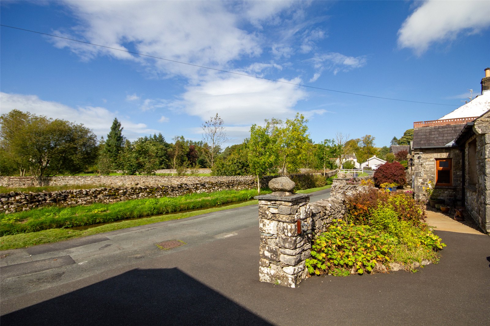 The plot is bounded by drystone walling and fencing with a generous driveway at the front and side leading to further parking and turning at the rear. The pretty front garden is paved for ease and has flower borders and a lovely mature acer. A gate leads to the front lane and there are views across the beck to open fields. There is a further off road space immediately to the front of the property. The rear garden has a patio space and two large raised flower borders and space for a good sized shed. By the back door are hot and cold taps and an external light.