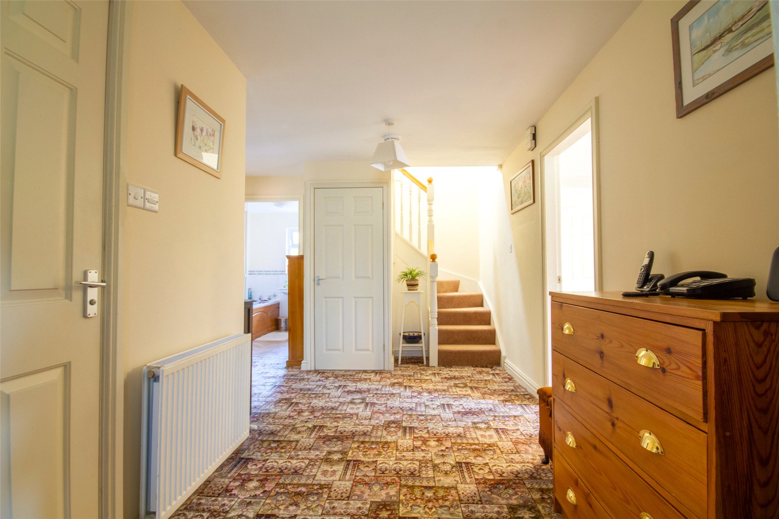 A generous hallway with a large under stairs cupboard (with light), a ceiling light and a radiator. Telephone point.
