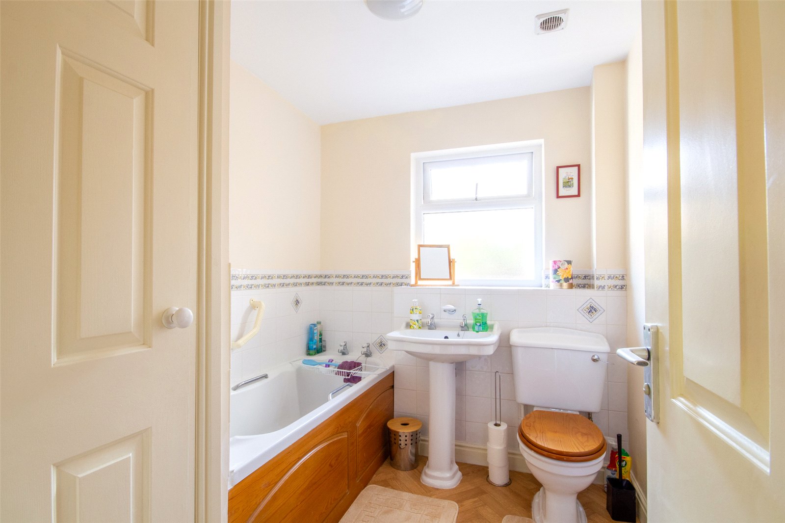 Frosted UPVC double glazed window to the rear aspect. Fitted with a pedestal hand basin, WC and bath. Chrome heated towel rail, an extractor and a ceiling light. Part tiled walls and a built in shelved cupboard.