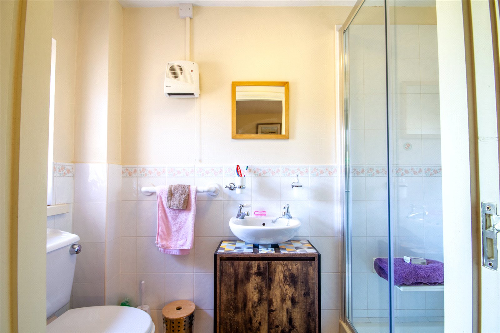 Fitted with a pedestal wash hand basin, WC and cubicle with aqua board panelling and a folding door. Mirror with sensor light, a chrome heated towel rail, ceiling light and extractor.