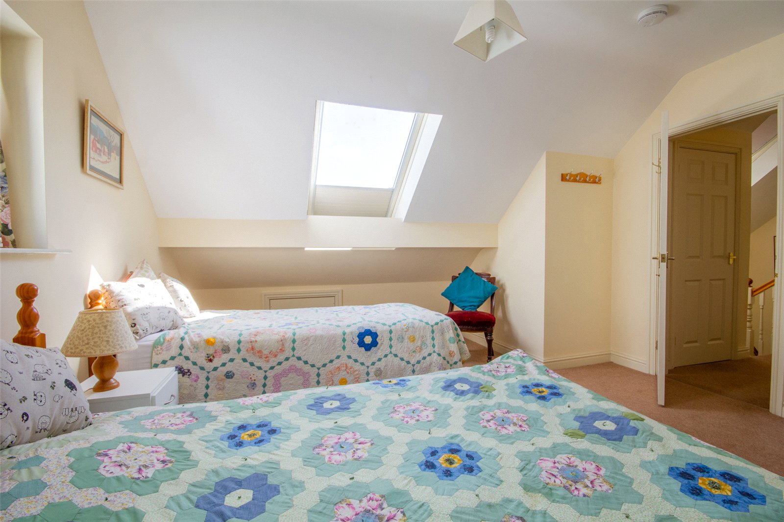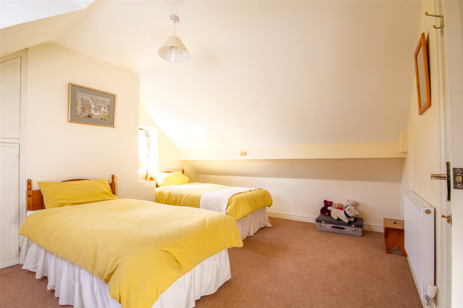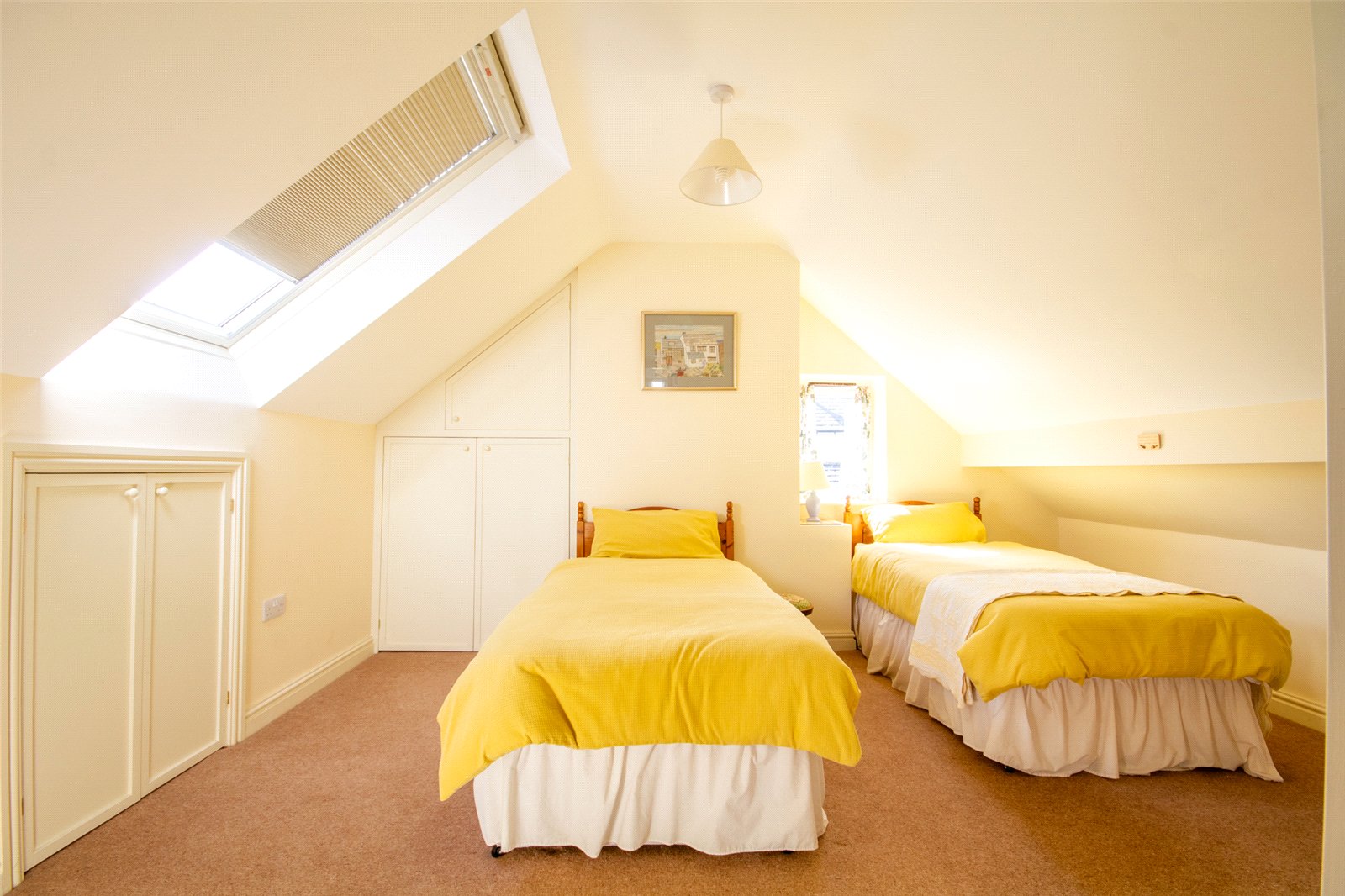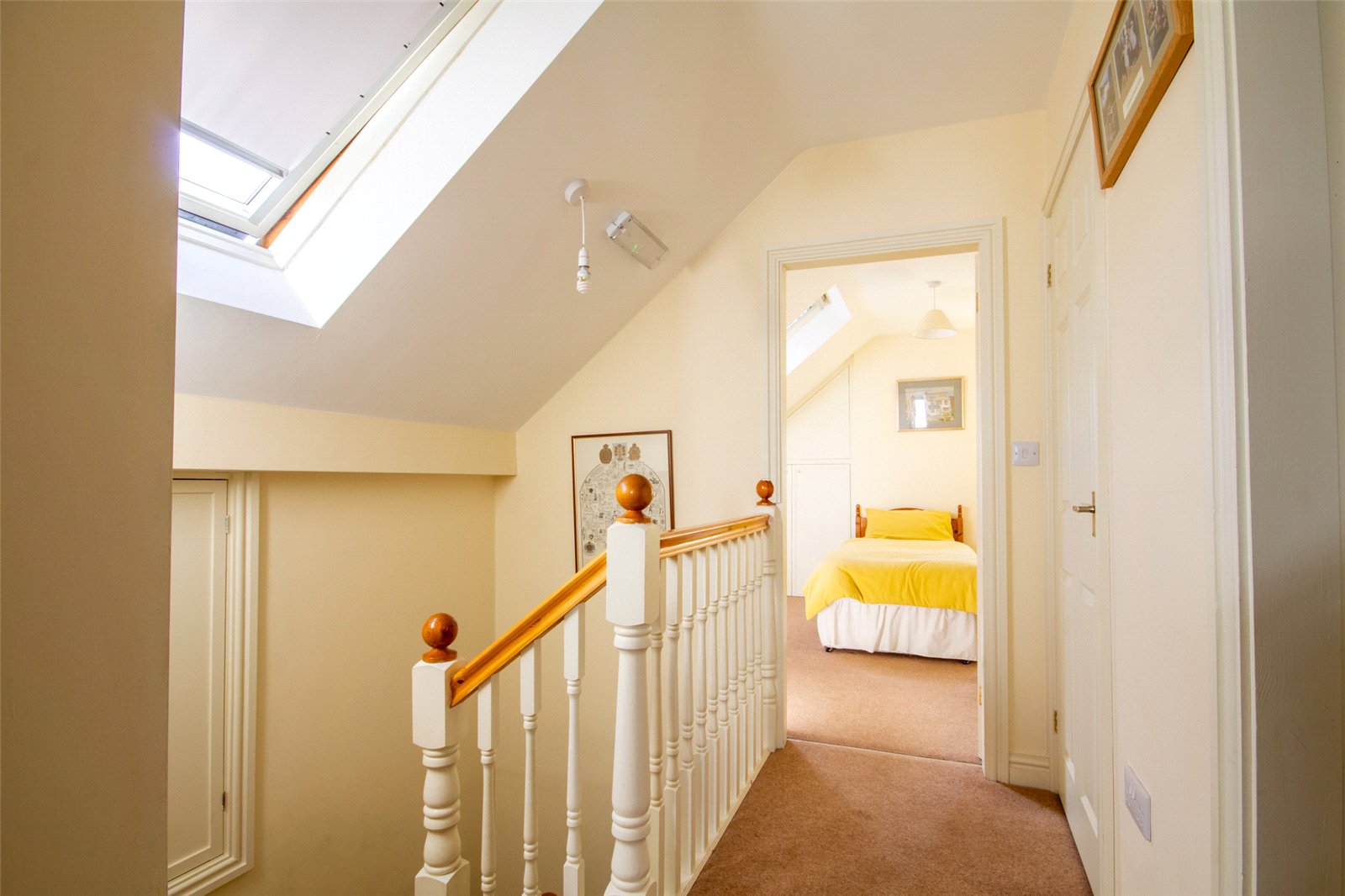 A large Velux rooflight floods the landing with light and there is a ceiling light and access to eaves storage. Generous storage has been created with a shelved walk in airing cupboard plus a further deep cupboard, also shelved and having a radiator.