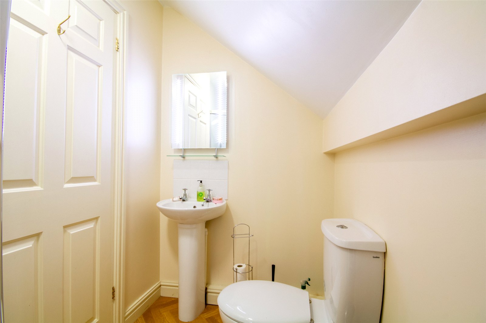 Fitted with cream shaker style base and wall units, pale marble effect worktops, glass splashbacks and a stainless steel one and a half bowl sink with drainer. There is an integrated fridge, dishwasher, induction hob with hood above and an electric double oven. Plumbing for a washing machine, a modern vertical radiator, two ceiling lights, under unit lighting and a useful understairs storage space. The Worcester boiler is concealed within a base unit.