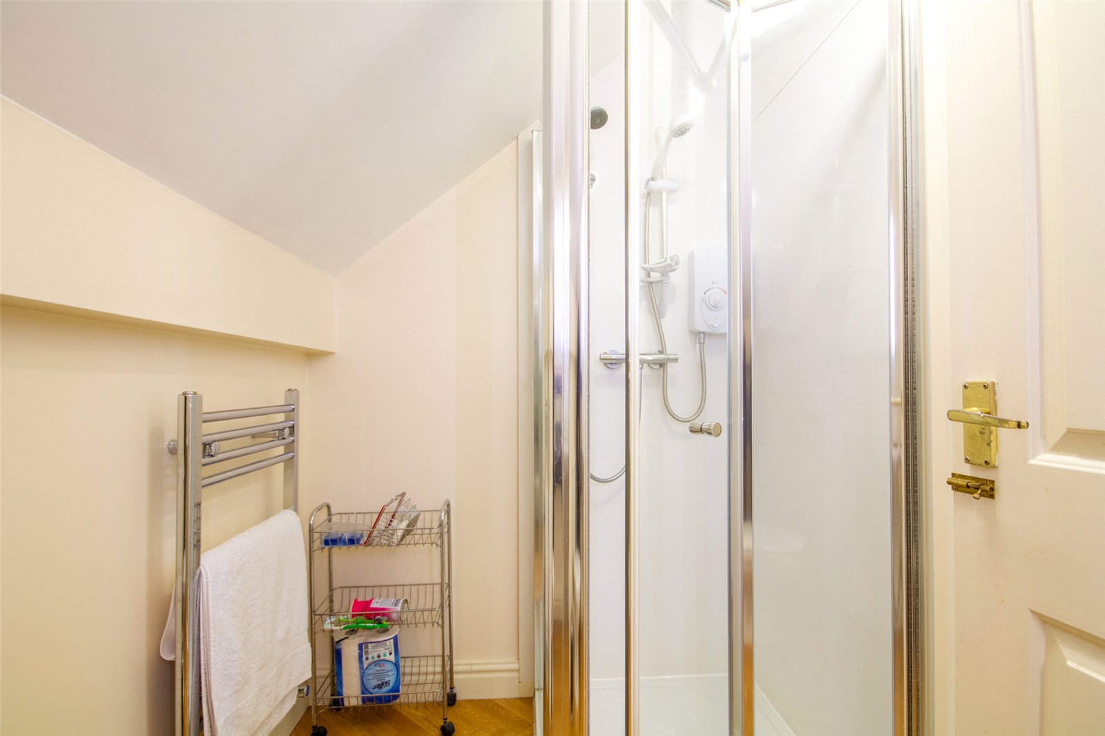 An excellent second ground floor facility, fitted with a double shower cubicle, a wash hand basin and WC. Part tiled walls, a ceiling light, extractor and chrome heated towel rail. A UPVC double glazed window faces the front aspect and the walls have been part tiled.