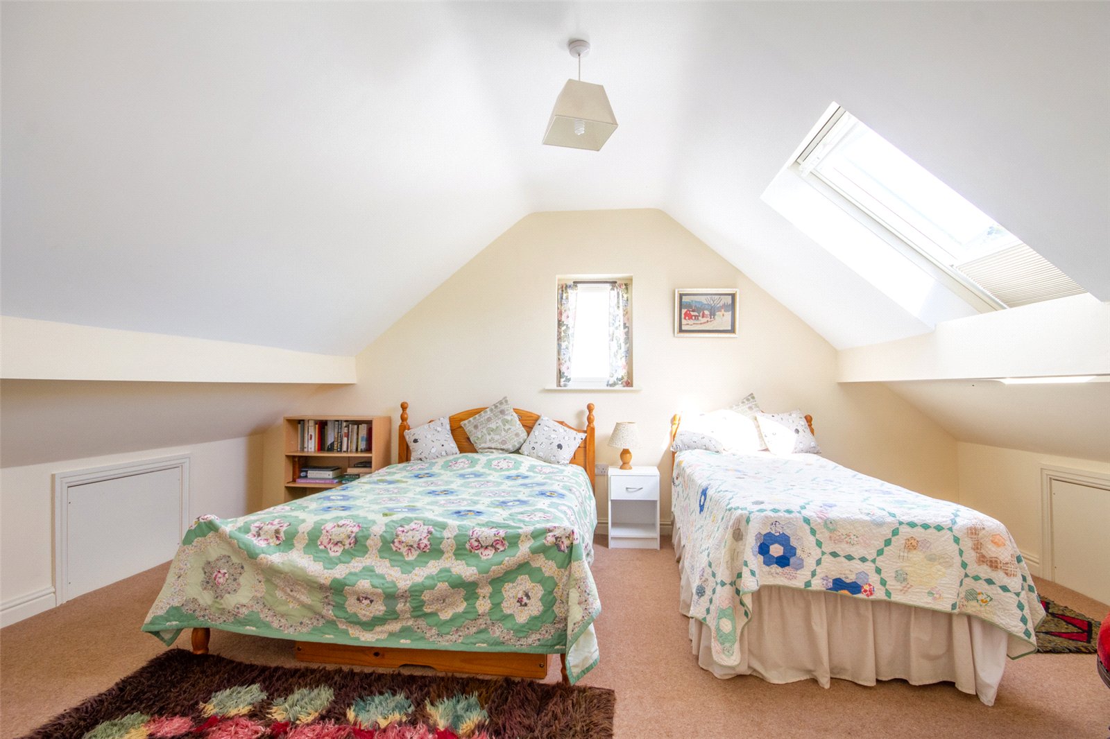 The fourth double bedroom has a ceiling light, radiator and two built in eaves storage cupboards. A large Velux rooflight faces the rear aspect and there is a double glazed window at the side.
