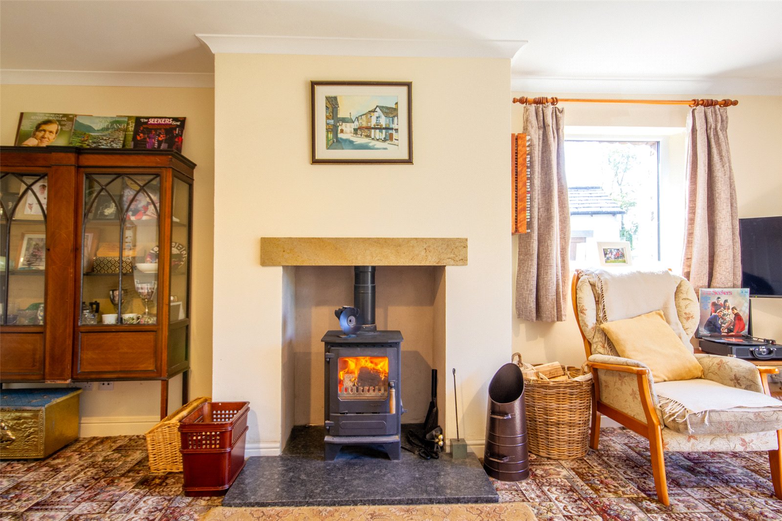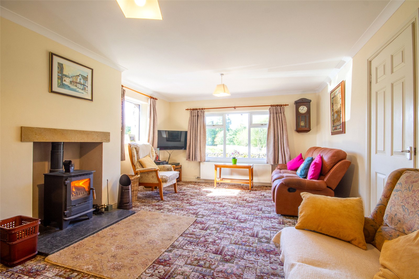 Overlooking fields and the beck towards Orton Village, the good sized sitting room has two ceiling light, a radiator and two UPVC double glazed windows. A woodburner is set on a polished hearth with a sandstone lintel above.