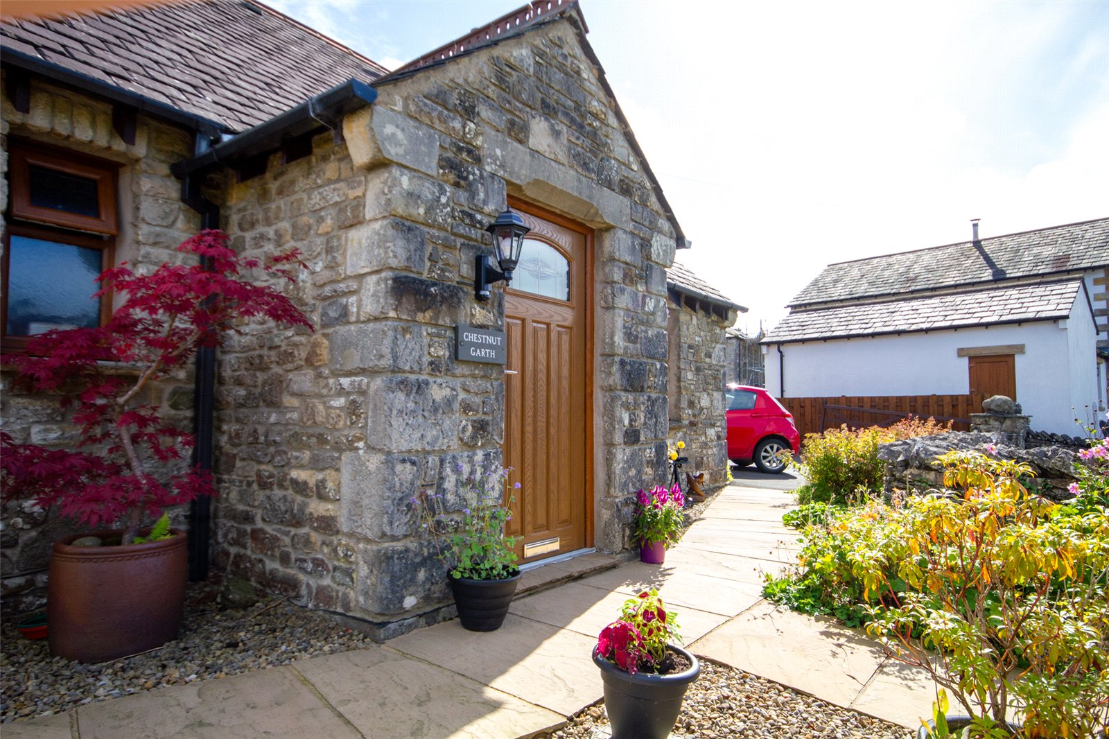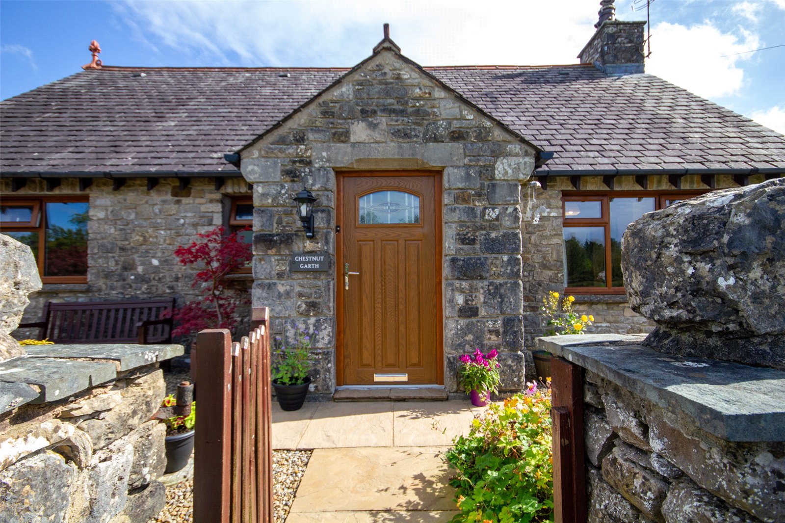 From the lane at the front, a wooden gate leads into the front garden and to the porch.