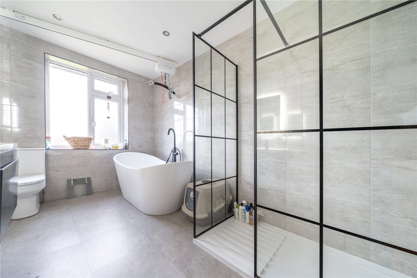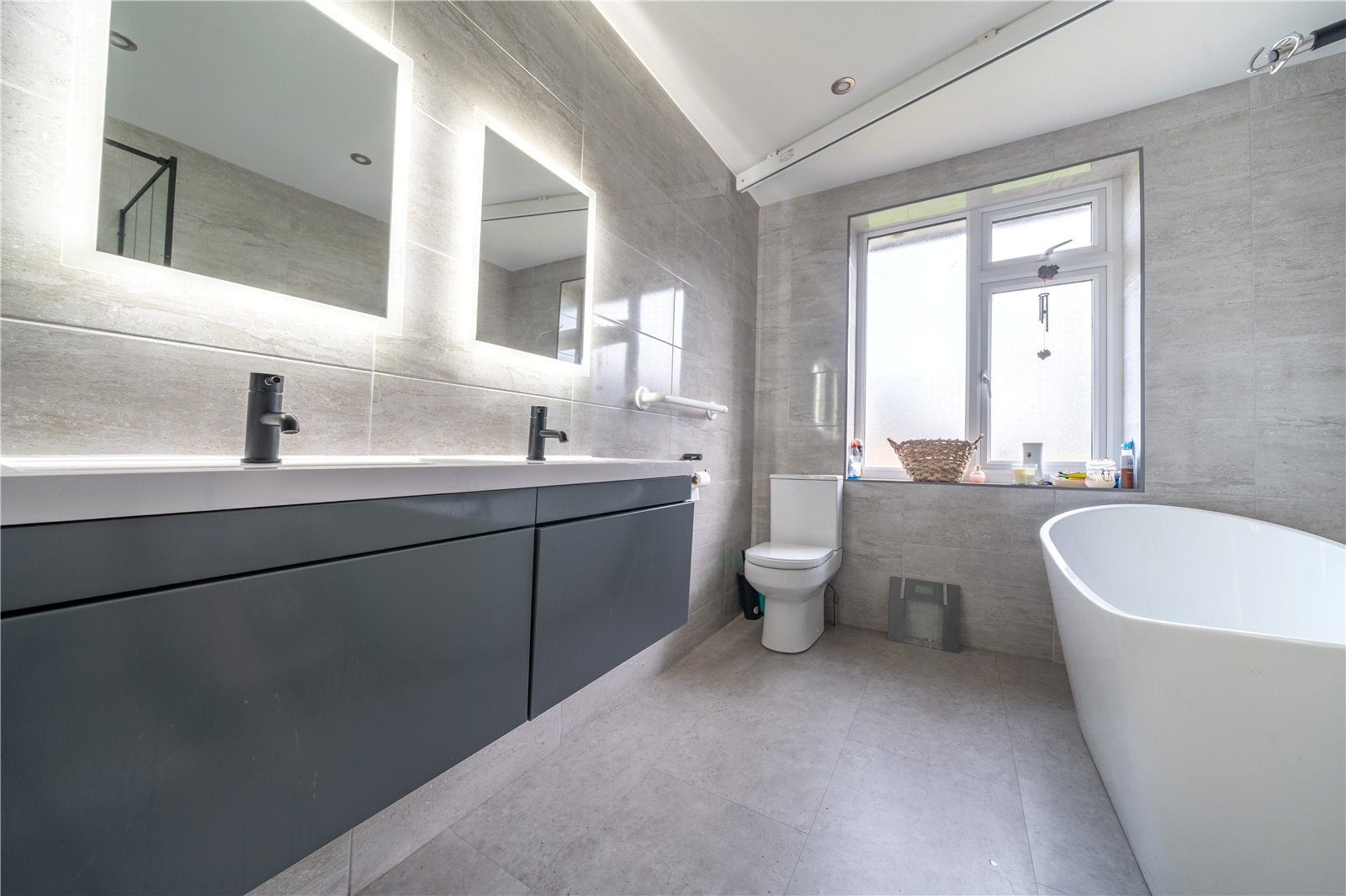 Having a luxurious high end feel, the bathroom has a frosted UPVC double glazed window and is fully tiled. There is a double ended freestanding bath with pillar tap and mixer, a WC, double vanity sinks with drawers beneath and a walk in double shower enclosure with Crittall style screen, fixed head and riser spray. A mirror above each basin, downlights and a modern heated towel rail.