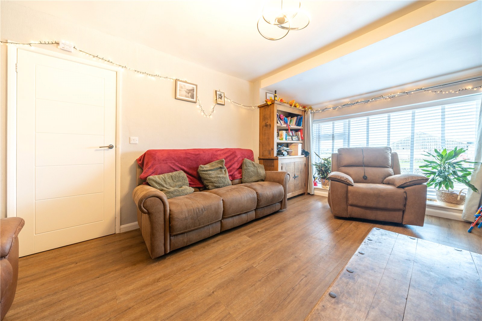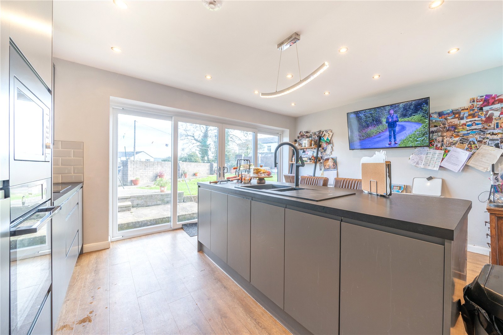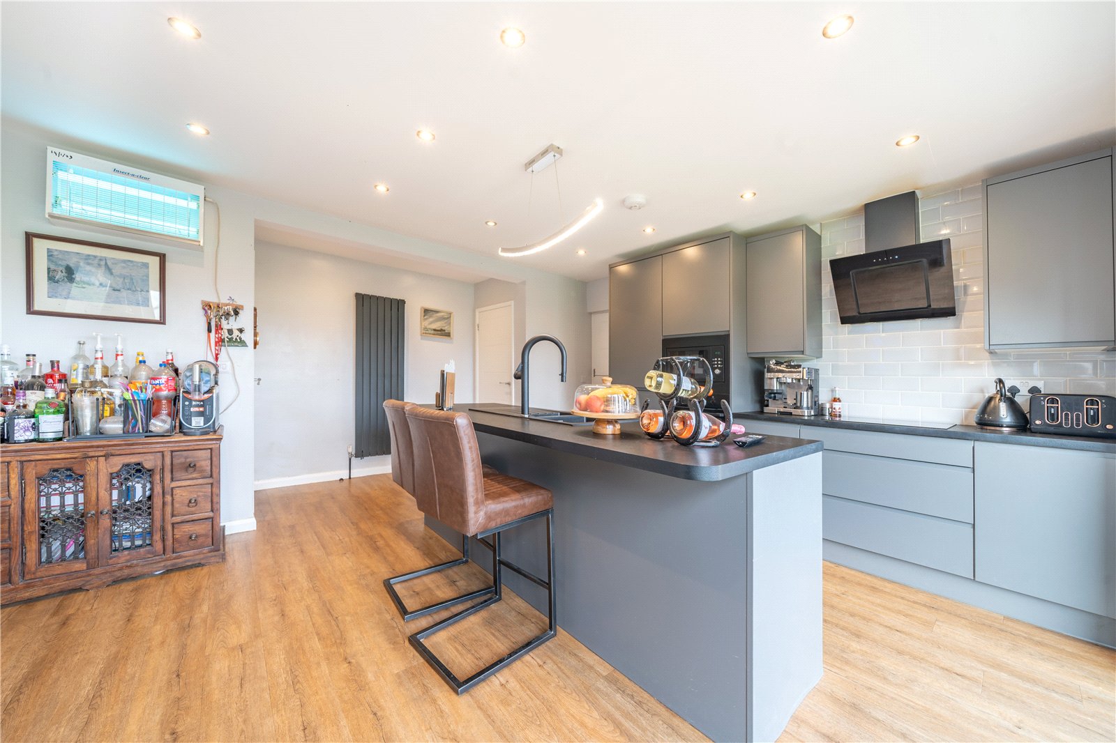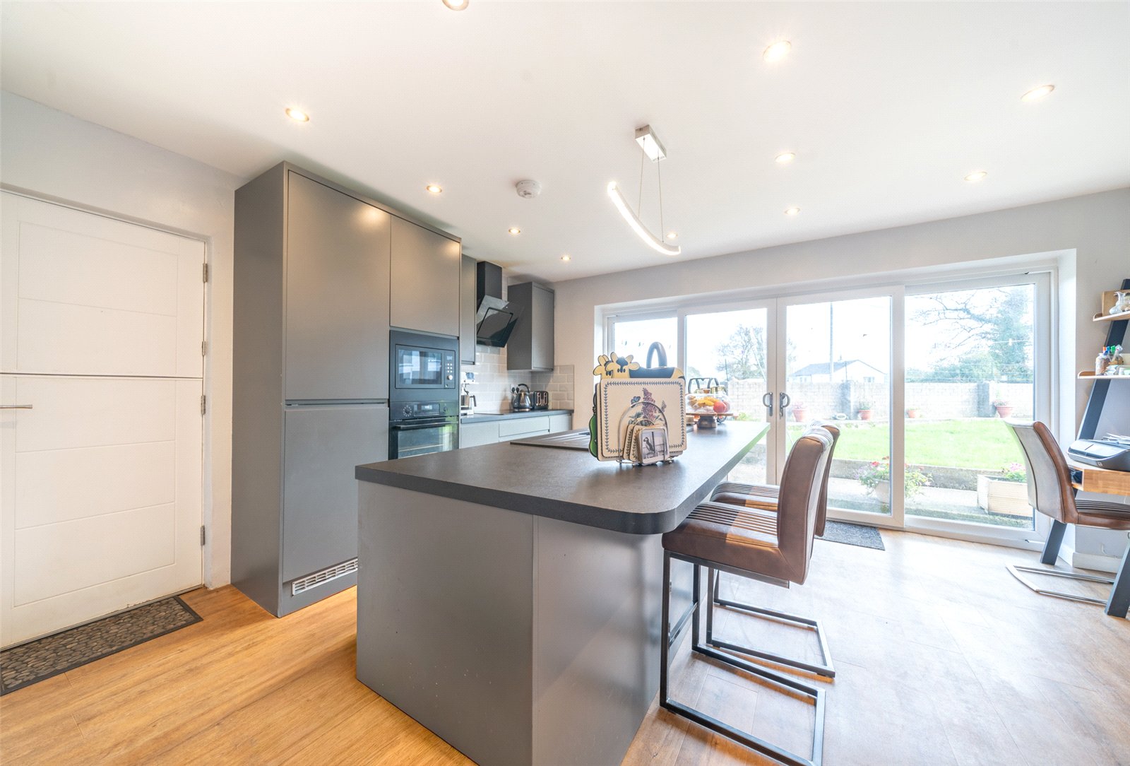 Having UPVC double glazed sliding patio doors to the rear garden plus large UPVC double glazed windows, the kitchen diner is light and bright and the perfect place for family meals. Fitted with grey handless base and wall units, dark worktops and a central island with breakfast bar. There is a one and a half bowl sink with drainer, an induction hob with modern canopy above, an integrated electric oven, microwave and fridge freezer. There are downlights, two radiators (one vertical) and a ceiling light above the island.