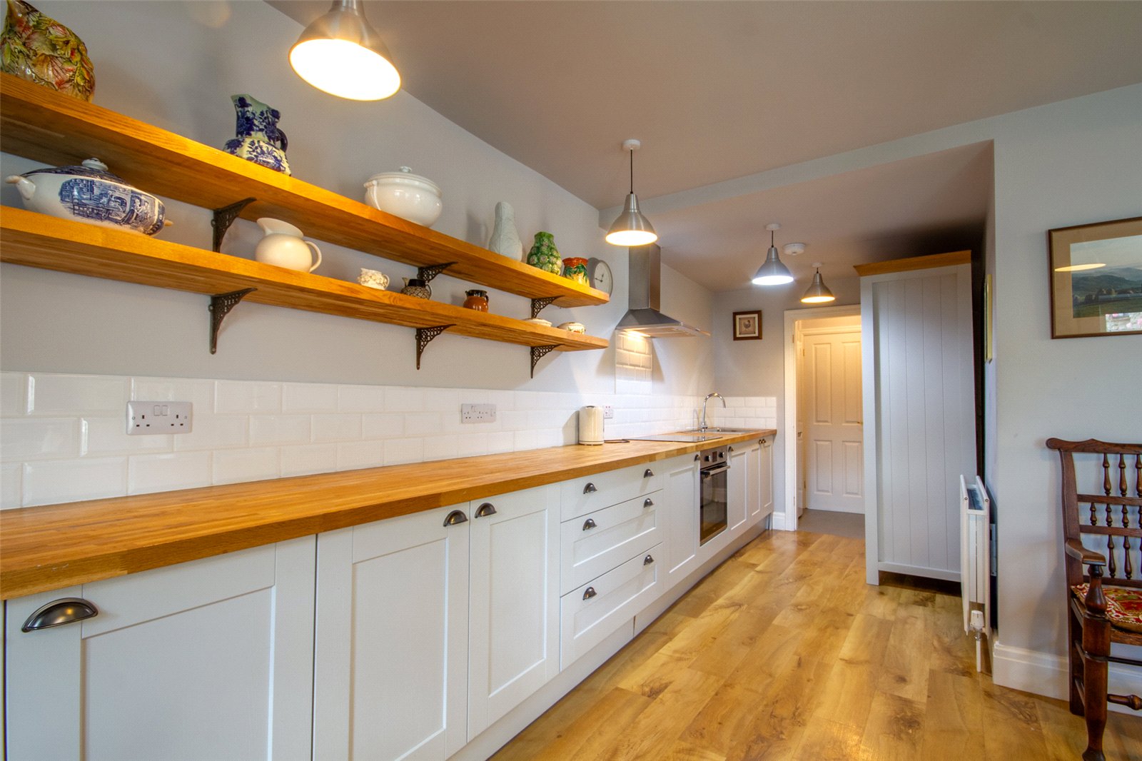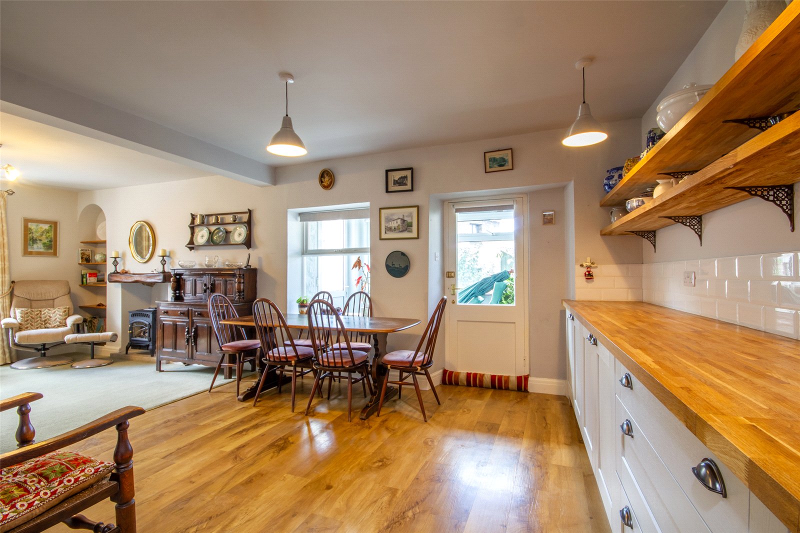 Opened up in recent years, this generous space is now perfect for social dining and relaxing. A UPVC double glazed window faces the front elevation and there is an internal window and door to the sun porch for extra natural light. The living space has a chimney recess for an electric fire, alcove shelving, a ceiling light and radiator. The kitchen has been fitted with grey shaker base units, wood block worktops and shelving and contemporary metro style tiling. Electric hob with canopy above, an electric oven, stainless steel sink unit and a freestanding larder unit with shelving and internal lighting. There are five ceiling lights and a radiator.