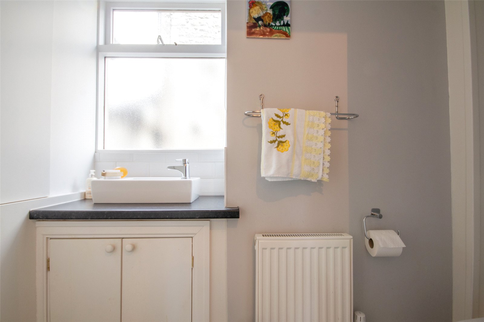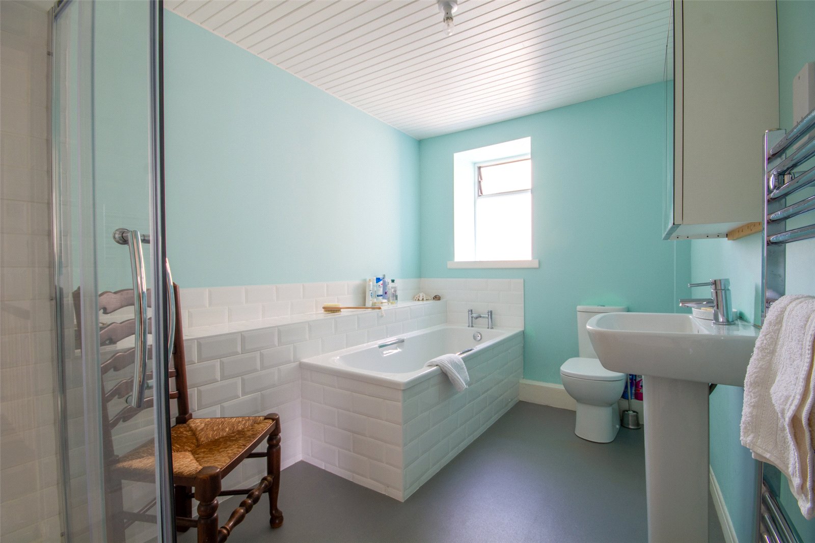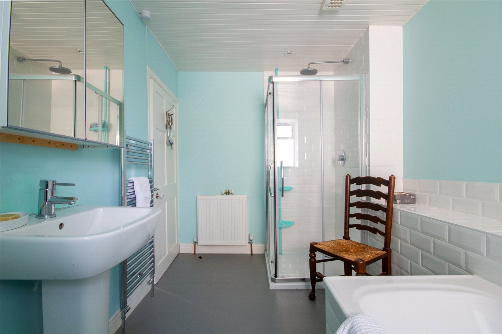 Frosted window with vents to the side aspect. Fitted with a bath, shower cubicle, pedestal wash hand basin and a WC. Metro style tiling, a ceiling light, extractor and a radiator. Chrome heated towel rail and a shaver point.